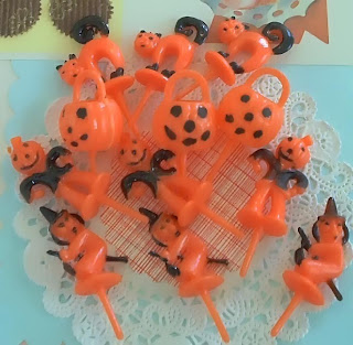 As I mentioned in my Fabulous Fall post, my mom was awesome (she still is) at creating memories and traditions, and she always made a huge deal over Halloween and holidays. One thing she did without fail was make spooky-themed food and treats, especially yummy cupcakes. Each year she topped them off with some of the toppers in the pictures below. Since she was also a vintage junkie and collector, a lot of the toppers she used were already oldies when I was a kid. My husband and I were looking at some of the pictures of various toppers and we each have memories of different ones from school fall festivals and elementary school classroom parties as well.