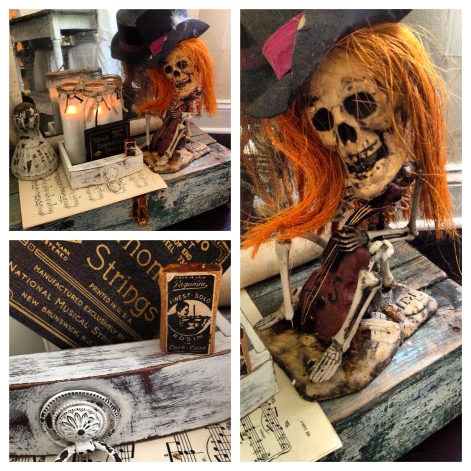 At the bottom of the cabinet I created this little shabby chic "Midnight Serenade" vignette. I am crazy about vintage claw foot tub feet, and I decorate with them all year, but the claws seem to look a bit more sinister when used in Halloween displays. The vintage strings and violin rosin were estate sale finds form the summer.
